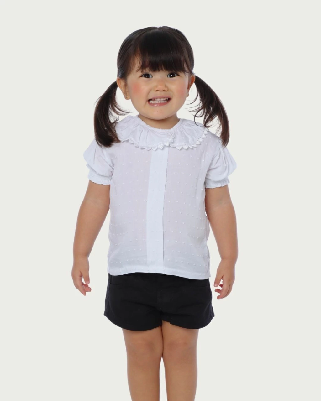 A blusa, produzida em tricoline 100% algodão, tem textura suave e toque fresquinho, com detalhes encantadores como a gola bordada e as mangas bufantes, que dão aquele charme especial sem abrir mão do conforto.