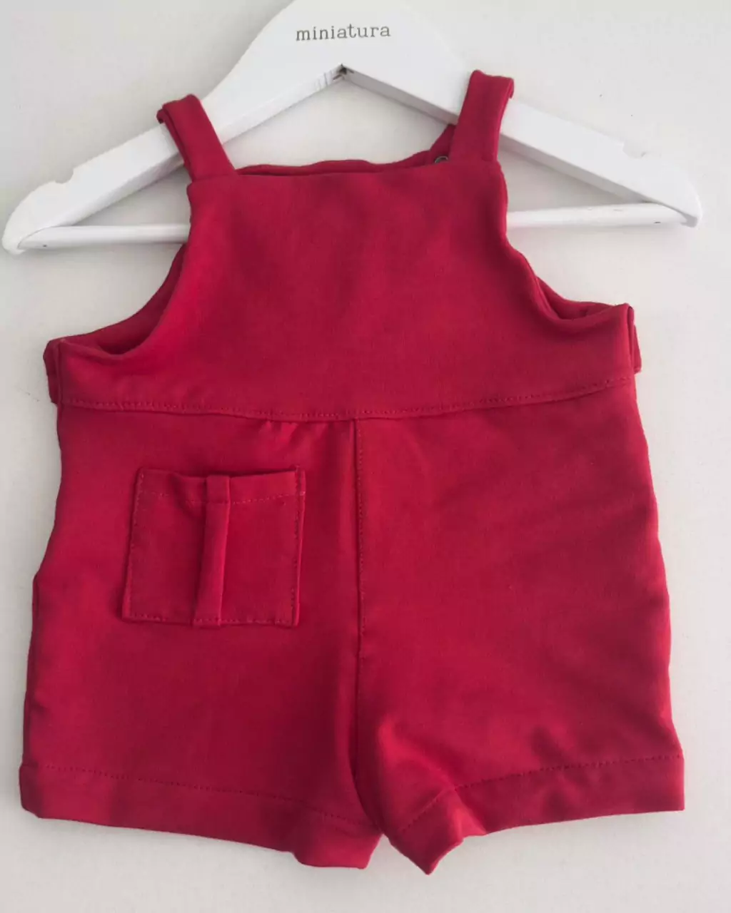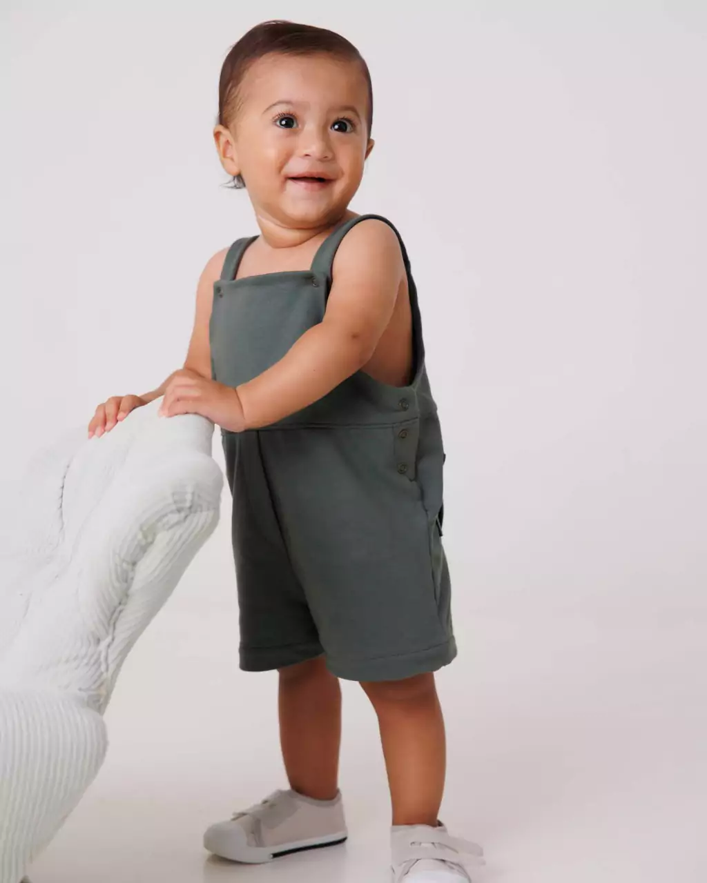 Os botões de pressão nas laterais facilitam a troca, enquanto os botões das alças permitem que o macacão seja ajustado conforme a altura do seu mini.