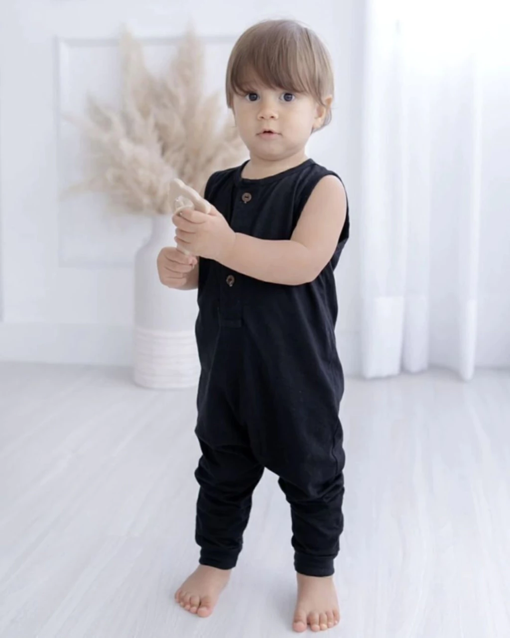 Perfeito para o dia a dia, o macacão Lucas preto é a peça que seus pequenos vão adorar vestir!